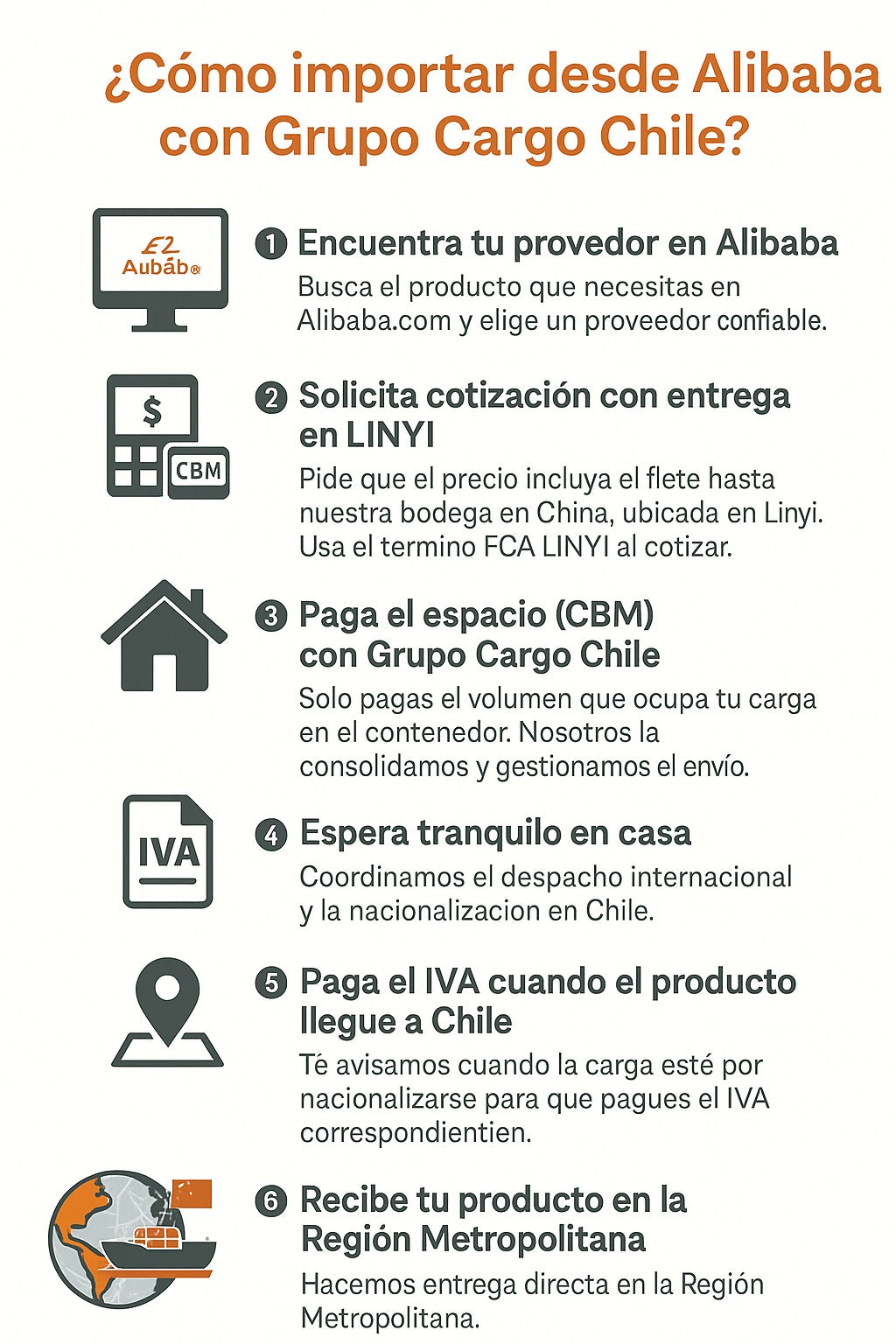 En Grupo Cargo Chile consolidamos tu carga en China y la entregamos en nuestra bodega en Santiago. ✅ Todo incluido: despacho en origen, flete, aduana y entrega en nuestra bodega en puente alto 📦 Solo pagas el espacio que ocupa tu carga y el IVA. ¡Fácil, claro y sin sorpresas!